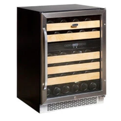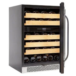 This wine storage system (BWR-462DZ) can hold up to 46 standard 750ml wine bottles; 16 bottles in the top zone and 30 bottles in the bottom zone. The powerful compressor cooling process offers optimum temperatures (low 40 degrees F to mid-60 degrees F) for red, white, and sparkling wines. The front ventilation design of this unit allows for flush with cabinet undercounter installation or simply freestanding usage.