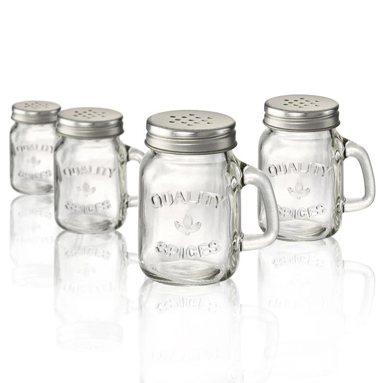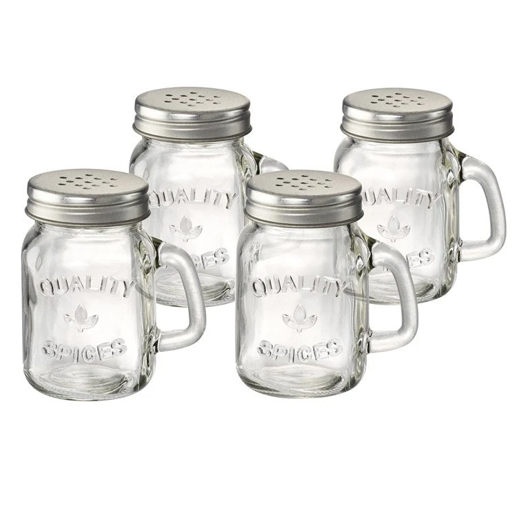 With their classic mason jar design and convenient handles, these American Diner salt and pepper shakers make a great addition to your farmhouse or country kitchen. Each shaker is made of clear glass embossed with “quality spices” and features a silver shaker cap.