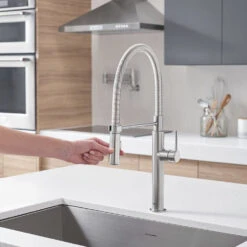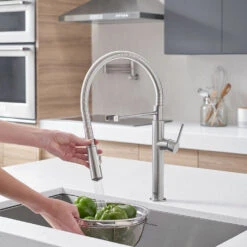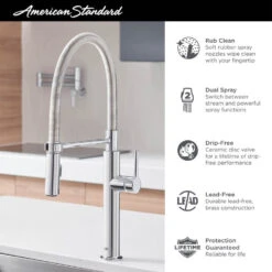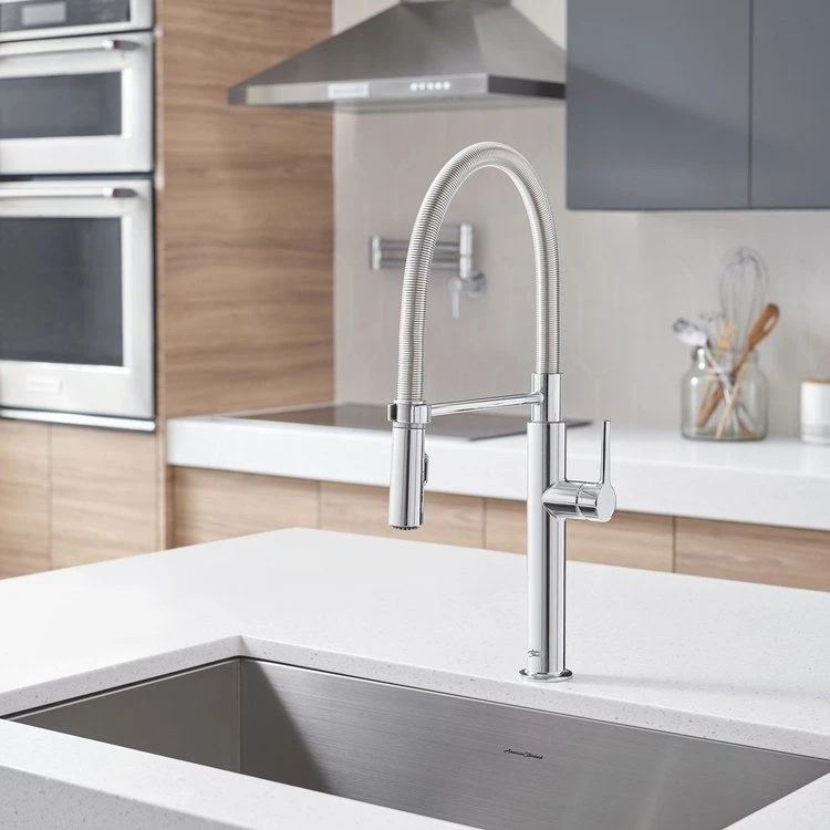 More than a professional look, the Studio S Semi Pro Dual-Spray Kitchen Faucet with Spring Spout from American Standard combines commercial-inspired design thoughtfully engineered for today’s home. Contemporary cylinder base with raised, one-piece lever handle and flexible stainless steel coil lends an impressive gourmet touch. Allowing easy maneuverability and ample room for filling large pots, this hardworking faucet is softened by a slightly flared, pull-down spray head that’s easy to grasp and offers stream and powerful spray functions. The perfect choice for a complete kitchen makeover or easy update, Studio S promises drip-free dependability and adds five-star distinction to your kitchen design.