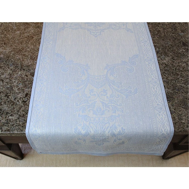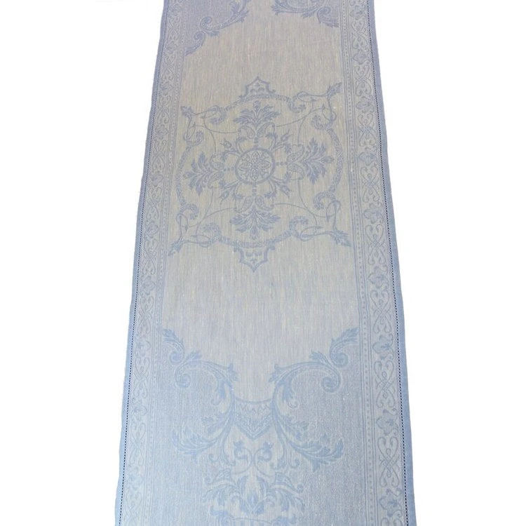 Enhance your dining room decor with French Home’s luxurious 20″ x 68″ Astra 100% woven linen table runners made in Portugal. The clean and graceful lines of the Astra table runner give way to an enchanting renaissance fairytale design in dreamy and romantic shades of ivory and pale blue that are showcased spectacularly by the woven jacquard fabric and is the ideal finishing touch to a beautiful table setting. When taken care of properly, these high-quality linen table runners can provide a lifetime of use. Steaming or ironing is required for peak smoothness and crispness after cleaning, in your washing machine or professionally.
