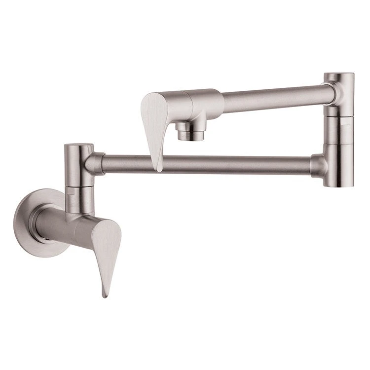 With its timeless, classic design and focus on simplistic luxury, the AXOR Citterio collection offers the ultimate in comfort and style for your contemporary kitchen. This two-handle pot filler faucet mounts to the wall to give you easy access to water above the stove. Reduces the strain of lugging heavy pots of water from the sink to the cooktop. The dual swivel arms give you the reach you need to fill any size pot or pan at any burner location. Dual handles let you shut off the flow at either the spout or the base. The faucet measures 26-15/16″ long when fully extended. Uses a 1/2″ NPT connection.