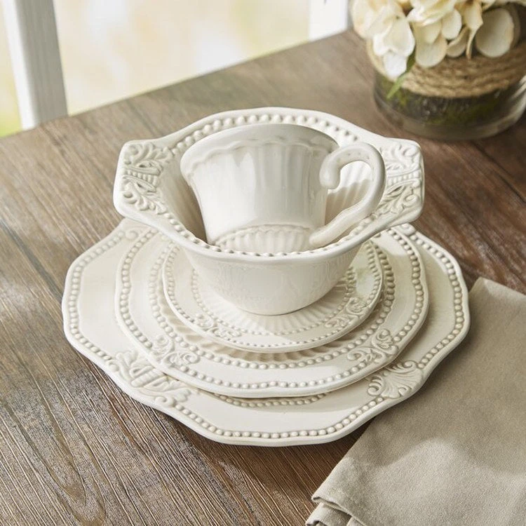 Steeped in classic charm, this 20-piece dinnerware set proves you don’t have to break the bank or leave your home to enjoy a meal in style. Offering service for four, this set includes square dinner plates, round salad plates, bowls, saucers, and mugs. Crafted of earthenware and finished in a glossy off-white, each design is dotted with dainty details like embossed scroll accents and beaded borders for a touch of texture. Beyond lovely, they’re also safe to go in the dishwasher and microwave, making it easy to reheat and clean up after meals.