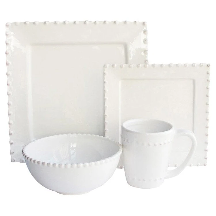 Set the table in style with this 16-piece dinnerware set, perfect for both casual morning breakfasts and upscale dinner parties alike. Offering service for four, each set includes four dinner plates, four salad plates, four dining bowls, and four mugs. Each piece features raised dot trim, finished in glossy white for versatile appeal with a dash of distinction. This set is crafted from earthenware, which is dishwasher safe for quick and easy cleaning.