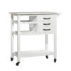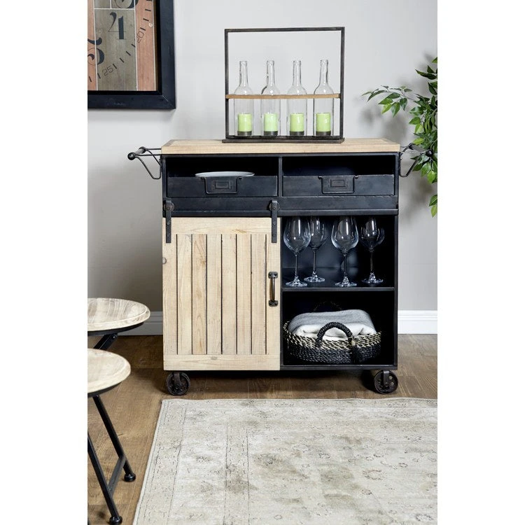 This industrial rolling bar cart can function as a console table and as a wine cabinet in the living room or home office. Looks stylish in your living room or kitchen for additional storage in any compact space. An optimal mobility piece of furniture that will help keep you tidy and organized. This item has a 3-compartment cabinet with a sliding door. 2 pull drawers measuring 15″ x 5″ x 15″.Ample storage: 2 drawers, 2 interior cabinets. Suitable for indoor use only. Some assembly required.300 lbs. max weight limit. Industrial theme