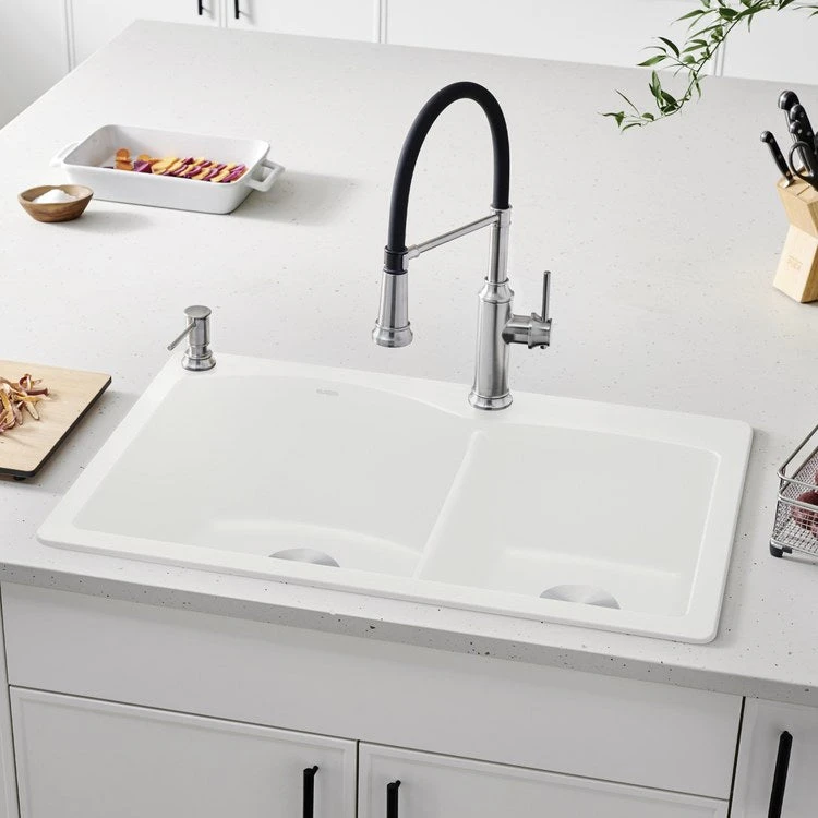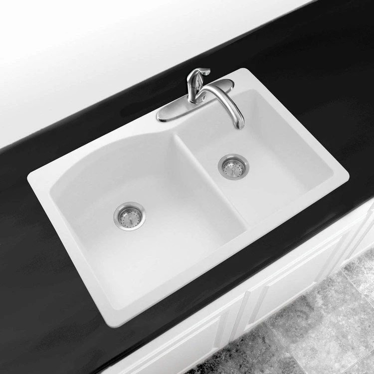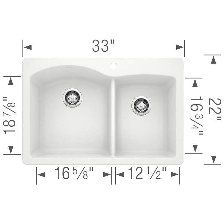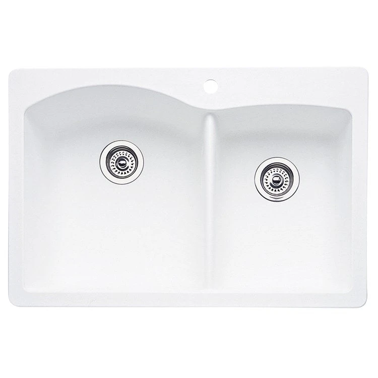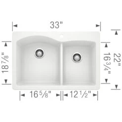 Blending beauty, function, and durability, this Diamond 33″ offset double-bowl dual-mount kitchen sink offers a stylish solution that meets the demands of your daily tasks. Made of Blanco’s patented Silgranit II non-porous material, the sink resists scratches, chips, and stains from all household acids and alkali solutions, including coffee, tea, and red wine. The 1-3/4 double-bowl design features a 16-1/2″ wide x 18-19/32″ long x 9-1/2″ deep basin on the left and a 912-1/2″ wide x 16-13/16″ long x 8″ deep basin on the right. The faucet ledge is pre-drilled with a single hole at the divide and pre-scored with three additional holes for easy knockout. The dual mount design allows either drop-in or undermount installation.