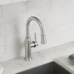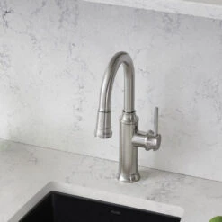 Empressa, inspired by German wine country, is characterized by signature details such as vintage wine press handles and an innovative pull-down, dual-spray spout. This collection is the perfect example of classic European design infused with modern features and functionality. This Empressa single-handle bar/prep faucet features a dual-spray pull-down sprayer and 180-degree swivel spout to reach all areas of the sink. The single lever handle offers easy operation and a streamlined look.