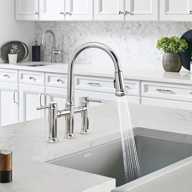 Empressa, inspired by German wine country, is characterized by signature details such as vintage wine press handles and an innovative pull-down, dual-spray spout. This collection is the perfect example of classic European design infused with modern features and functionality. The Empressa bridge faucet combines traditional bridge characteristics with modern refinements. Vintage, wine-press-inspired dual handles and a functional pull-down spray head defines this unique faucet style.