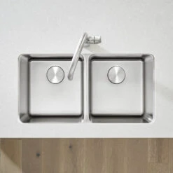 Formera kitchen sinks provide a versatile, on trend design that blends modern lines with practical functionality. A satin polish finish and radius corners of up to 30 degrees make this series both smooth to the touch and easy to clean. This 33″ double bowl kitchen sink undermount kitchen sink features two equal-sized 26″ long x 16″ wide x 9″ deep basins, perfect for use for separate washing and rinsing tasks.