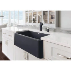 The single-bowl design features a 26-5/16″ wide x 15-1/4″ long x 9-1/4″ deep basin to handle cleaning even large pans with ease. The sink has a 10″ high apron front, a 1-1/2″ thick rim, and 3-1/2″ rear drain opening. The stylish designer color will complement any kitchen decor. Does not include drain assembly (sold separately.)