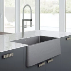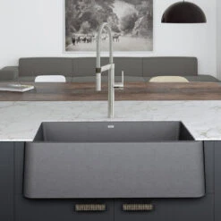More than beautiful, the Ikon apron front sink is the perfect combination of design, function and durability. Made of Blanco’s patented non-porous Silgranit granite composite material, the sink resists scratches, chips, and stains from all household acids and alkali solutions, including coffee, tea, and red wine. The single-bowl design features a 29-5/16″ wide x 15-1/4″ long x 9-1/4″ deep basin to handle cleaning even large pans with ease. The sink has a 10″ high apron front, a 1-1/2″ thick rim, and 3-1/2″ rear drain opening. The stylish designer color will complement any kitchen decor. Does not include drain assembly (sold separately.)