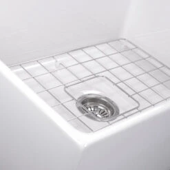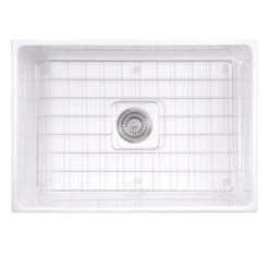 Elegant lines taper 1/4″ slightly from top to the bottom of the basin. The eco-friendly, glazed fireclay surface inhibits bacterial growth more than stainless steel, making it easy to clean. The sink comes with included bottom grid and basket strainer drain. Due to the firing process, dimensions are nominal and may vary to actual up to 0.25″. A minimum 30″ custom cabinet is required to support weight of this sink.