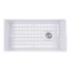 The Nantucket Sinks T-FCFS36 36″ white farmhouse fireclay sink features elegant lines and a wide basin offering just the right touch for a full-capacity kitchen! This sink is reversible so the offset drain can be placed on the side of your preference. The sides of sink have a slight 1/4″ taper from top to bottom.