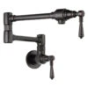 This two-handle, wall-mounted pot filler faucet makes it easy to fill pots full of water right at the stove. Saves you the hassle and effort of lugging a heavy pot from the sink to the cooktop. This faucet features cross-style handles and a double-jointed design that pivots out to reach any burner location and folds back against the wall when not in use. Measures 26-1/4″ long when fully extended.