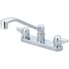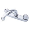 This two-handle widespread kitchen faucet features durable solid brass construction, brass valve bodies, a swivel spout, and classic cross-style handles with quarter-turn washerless ceramic disc valve cartridges to ensure smooth operation and drip-free performance. Measures 8-3/4″ high with a 9-7/16″ spout reach.