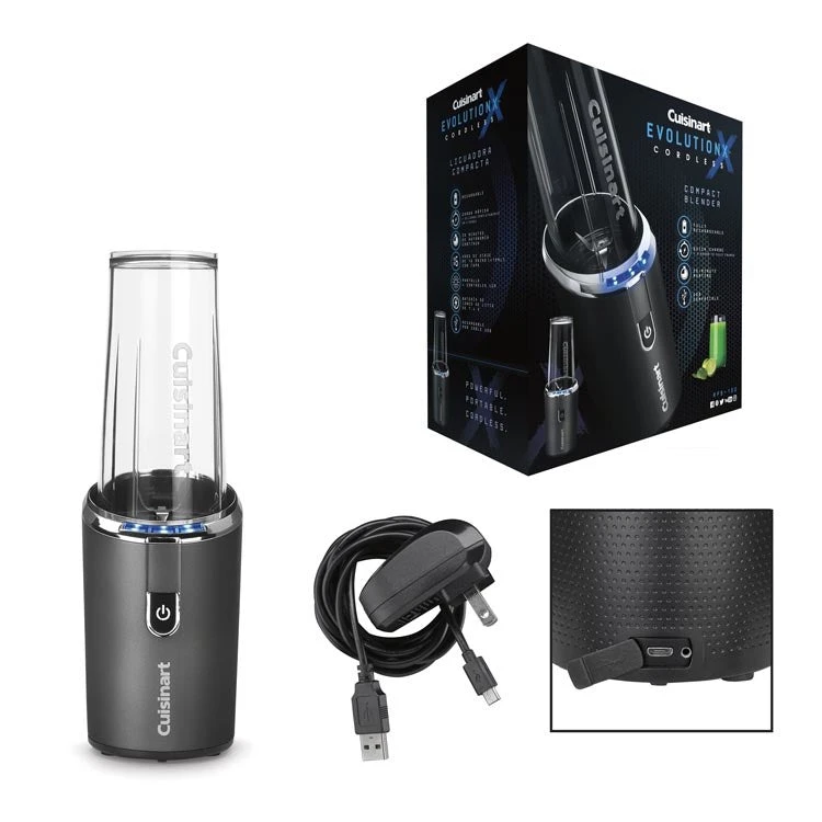 Compact, cordless convenience meets full-size professional performance. Powered by 7.4 volts of lithium ion efficiency and easily rechargeable with a USB cord, the EvolutionX Cordless Rechargeable Personal Blender does it all, from blending smoothies and shakes to crushing ice and pureeing soups. Portable. Powerful. Perfect or use at home or on the go!