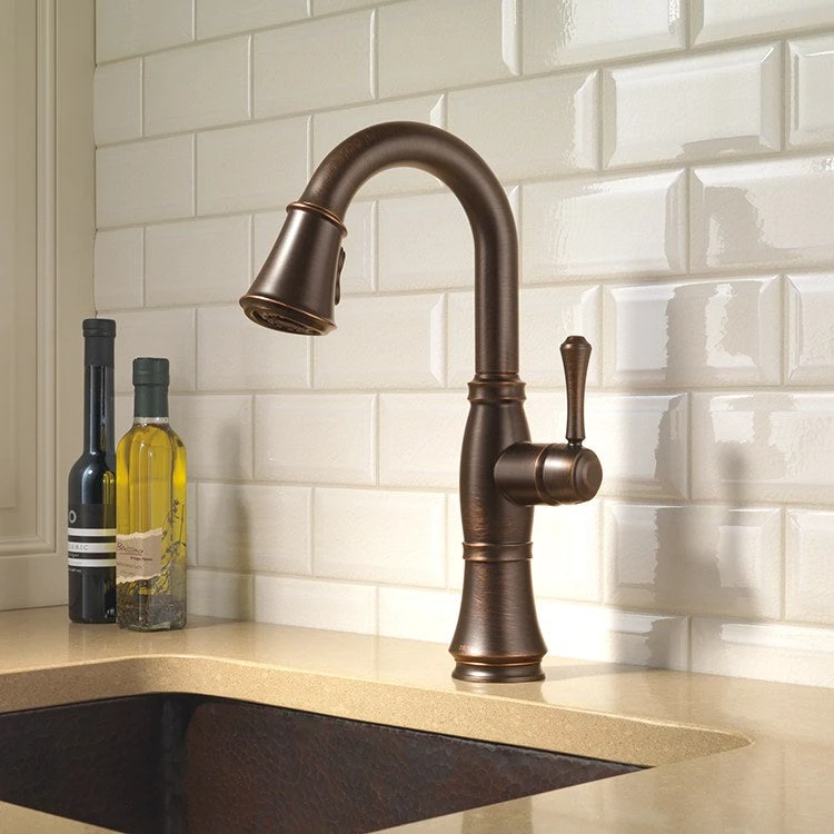 Inspired by a female silhouette with a cinched waist, the traditionally styled Cassidy collection features clean lines and elegant design details. This single-handle, pull-down bar/prep faucet features a 360-degree rotating spout with a pull-down sprayer, an ADA-compliant lever handle with hot/cold markings, and a diamond-embedded ceramic disc cartridge for smooth, drip-free operation.