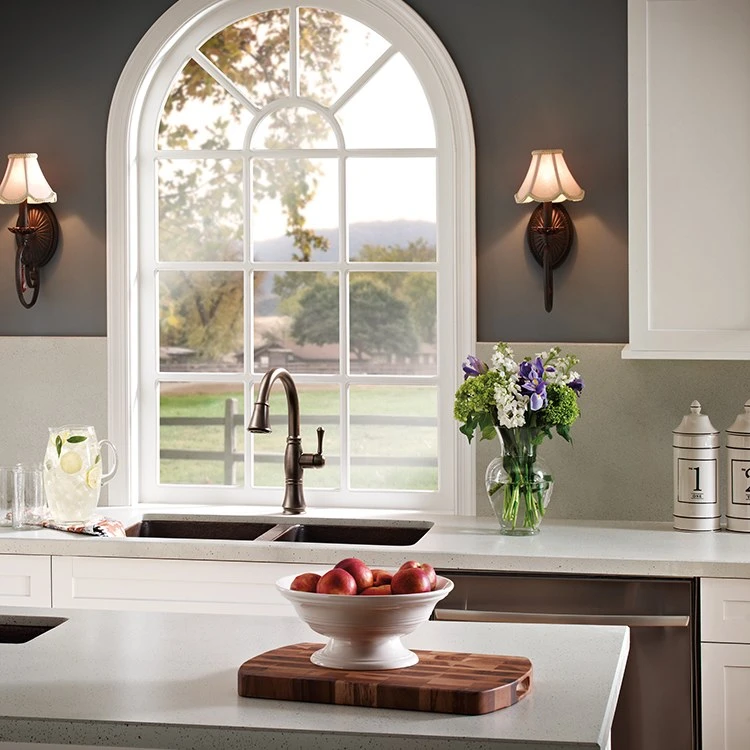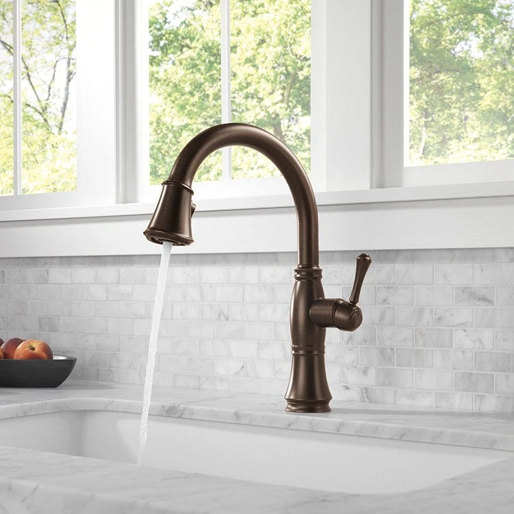 Inspired by a female silhouette with a cinched waist, the traditionally styled Cassidy collection features clean lines and elegant design details. This single-handle, pull-down kitchen faucet features a 360-degree rotating spout with a pull-down sprayer, an ADA-compliant lever handle with hot/cold markings, and a diamond-embedded ceramic disc cartridge for smooth, drip-free operation.
