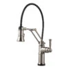 Foundations offers an enduringly simple way to outfit your kitchen with a clean, classic look suited to any environment. This two-handle kitchen faucet features lever handles with 1/4 turn stops, a standard swivel spout that swings 360 degrees, and an integral escutcheon for two or three-hole mounting. Measures 6-7/16″ high with a 9-1/4″ spout reach.