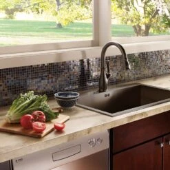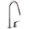 The Leland collection brings together traditional styling and modern functionality in dramatic fashion for a timeless look. This single handle kitchen faucet has a sleek design inspired by the shape of a teapot and features a beautifully integrated pull-down spout. The high arc spout swivels a full 360 degrees for full sink coverage and has Touch-Clean spray holes for easy removal of hard water build-up. The pull-down wand operates in an aerated or spray mode via an ergonomic toggle diverter and locks securely in place using the MagnaTite magnetic docking system when not in use. The handle button has red/blue graphics to indicate hot/cold temperature. Measures 14-7/8″ high with a 9-13/64″ spout reach. Comes with 3/8″ O.D. straight, staggered PEX supply lines and optional escutcheon for 3-hole installations.