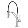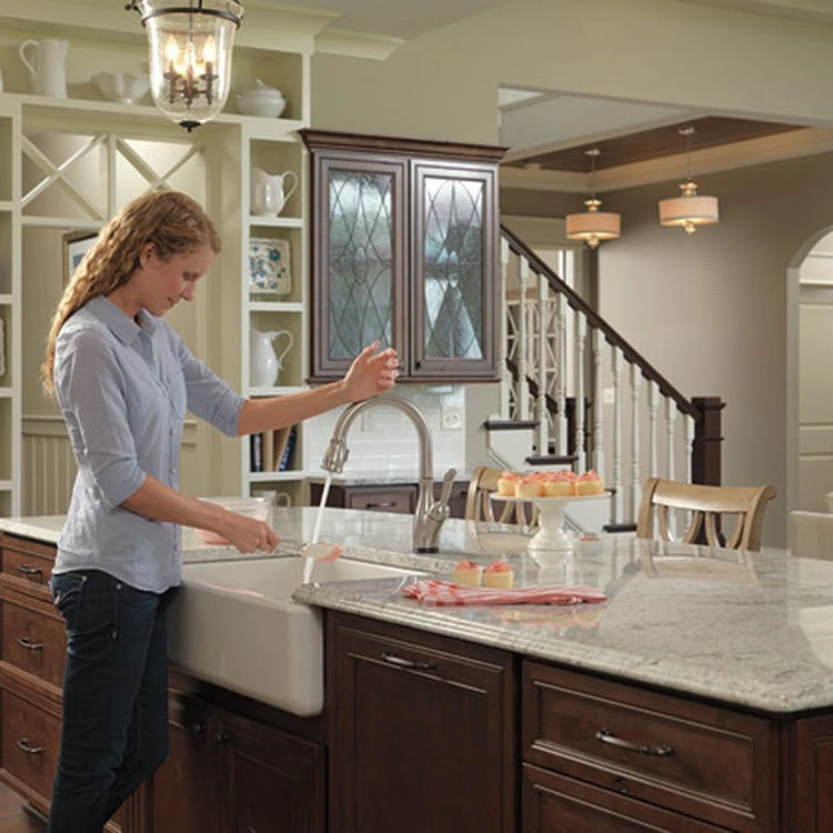 The Leland collection brings together traditional styling and modern functionality in dramatic fashion for a timeless look. This single handle kitchen faucet with Touch2O technology gives you the choice of manual operation using the lever handle or touch activation by simply tapping the faucet anywhere on the spout or handle. Faucet features a TempSense LED light to indicate water temperature, automatic shut-off after four minutes if water is left running, and a low battery signal light. Uses six AA batteries (included) for up to a 2-year battery life or six C batteries (not included) for up to 5-year battery life. The high arc spout swivels a full 360 degrees for full sink coverage and has Touch-Clean spray holes for easy removal of hard water build-up. The pull-down wand operates in an aerated or spray mode via an ergonomic toggle diverter and locks securely in place when not in use. The handle button has red/blue graphics to indicate hot/cold temperature. Measures 14-7/8″ high with a 9-13/64″ spout reach. Comes with 3/8″ O.D. straight, staggered PEX supply lines and optional escutcheon for 3-hole installations.