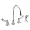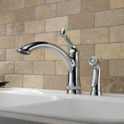 The Linden collection lends a friendly and whimsical air to your kitchen decor with its unexpected curves and stylish flares. This single-handle kitchen faucet features a smoothly arched swivel spout that rotates 120 degrees, a gently curved lever handle, finished hot/cold indicators, an optional 10-1/2″ escutcheon for use in three-hole mounting applications, and a separate, deck-mounted side sprayer. The faucet spout measures 8″ high with a 9-13/16″ reach. Includes 3/8″ O.D. straight, staggered PEX supply lines.