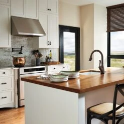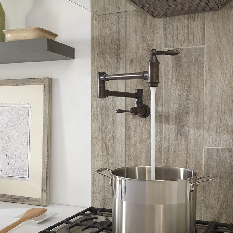 Stop hauling heavy pots from sink to stove. This single-hole, two-handle pot filler lets you fill them right at the stove. Features a dual handle design with simple on/off control that allows you to turn the water off at either the wall or the spout, controlling the water flow at the point of use. The 24″ dual jointed swing spout that lets you reach pots at any burner location on even the larger cooktops and allows you to easily fold the spout away when not in use. The simple, elegant lines provide versatile styling for both traditional and transitional decors. Measures 8-17/32″ high x 26-31/32″ deep x 2-3/8″ wide. Convenient single-hole mount. Cold water only.