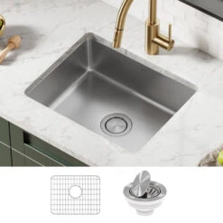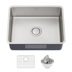 - Sink kit includes: large single bowl undermount sink, protective bottom grid with soft rubber bumpers, VersiDrain assembly with removable strainer and flip cap