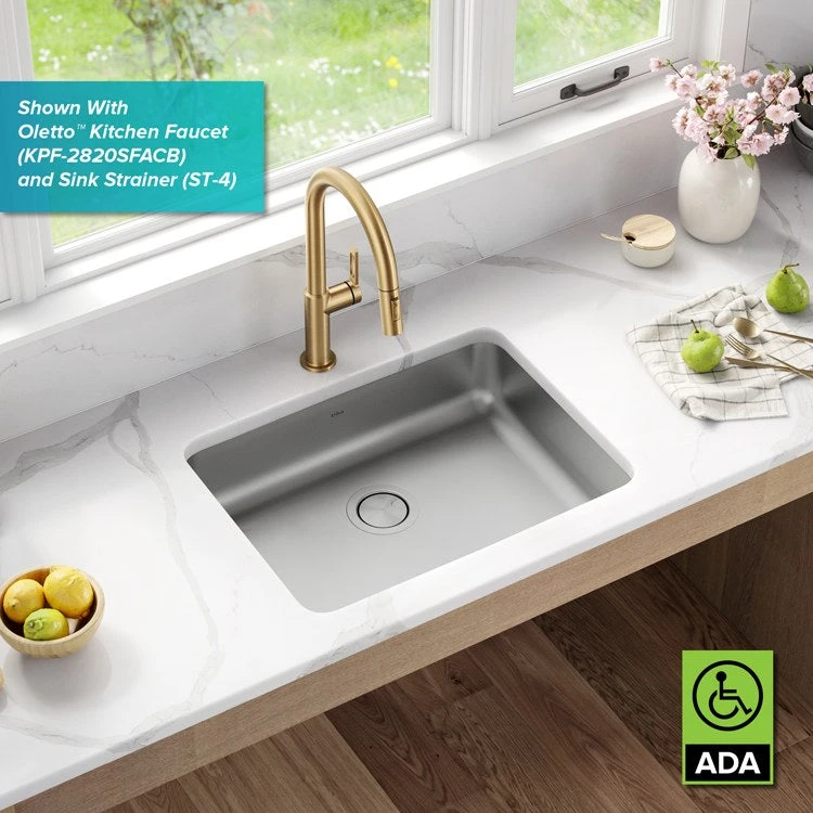 The Dex Series utilizes a combination of naturally antibacterial materials and modern product design to promote a clean and healthy kitchen. The only sink of its kind, Dex is constructed from proprietary Kraus T304Plus stainless steel, enhanced with antimicrobial copper ions to eliminate up to 99.9% of bacteria that touches the sink surface. This gives Dex unparalleled germ-fighting capabilities, making it one of the cleanest kitchen sinks on the market. The contemporary ADA-compliant design features rounded corners for a fresh look that brings modern style to any kitchen. Engineered for superior durability, Dex sinks are made with high-performance TRU16-Gauge stainless steel to stand up to everyday needs. Wear-resistant Radiant Pearl finish masks scratches and scuffs that can occur over time for a long-lasting lustrous sheen. The smooth stain-resistant surface is easy to clean and maintain. Featuring an ADA-compliant 5 1/4″ depth, this spacious single bowl sink is safe and easy to use for individuals with limited mobility. Designed to maximize usable workspace with a rear-set drain, Dex sinks give you even more room for washing dishes and produce. Rounded corners allow for easy cleaning and eliminate build-up over time. A gently sloped bottom allows for complete drainage and prevents water from pooling in the sink. Super-silencer NoiseDefend pads reduce the tinny sound of running water for a quiet kitchen experience. Undermount installation creates a seamless transition from countertop to sink for easy cleaning, preventing debris from getting stuck when you’re wiping down the counters. Cutout template and mounting hardware are included for hassle-free installation.