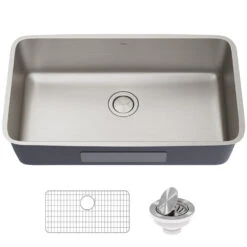 - Sink kit includes: large single bowl undermount sink, protective bottom grid with soft rubber bumpers, VersiDrain assembly with removable strainer and flip cap