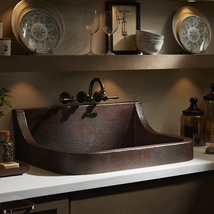 The perfect accessory to the well-appointed kitchen, this is the sink that will make your friends envious. The Diaz’s single-bowl design is crafted from one seamless sheet of hand-hammered copper and finished in a radiant Aged Copper. The sink features an integrated backsplash and mini-apron around the rim. Made of 14-gauge copper, the sink is easy to clean and maintain, and will develop a natural patina over time. Coordinating drain is available and sold separately. Note: Due to the handcrafted nature of this product, dimensions and finish may vary slightly. The sink is not pre-drilled with holes to allow you to install the faucet of your choice.Faucet is not included.