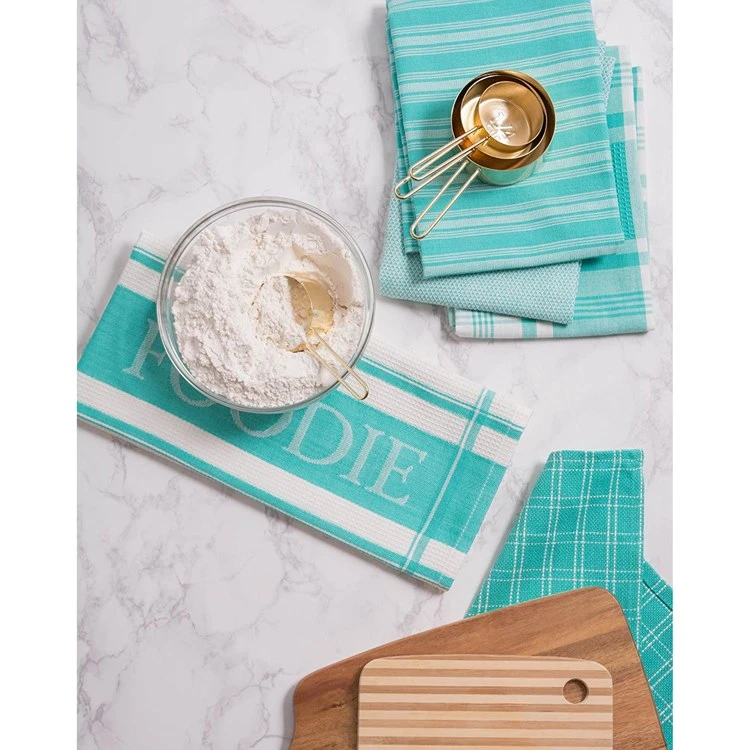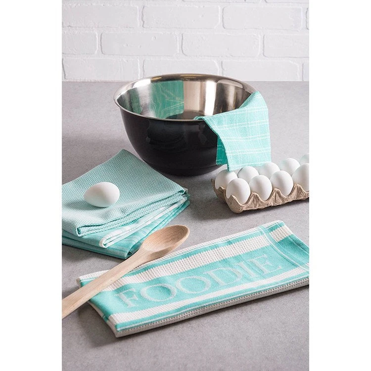DII’s Assorted Foodie Dish Towels are must-own kitchen essentials for every household, they are customers’ all-time favorite. These sets are perfect to coordinate your kitchen or give as a hostess or housewarming gift. DII 100% cotton, machine washable five-piece everyday kitchen dish towel set, includes four dish towels and one dish cloth. Each dish towel is oversized, measuring 18″ x 28″ and dish cloth measures 12″ x 12″. The oversized dish towel makes sure dishes and countertops are dry while the dish cloth ensures everything is scrubbed down. Design Imports sets are available in a variety of colors.