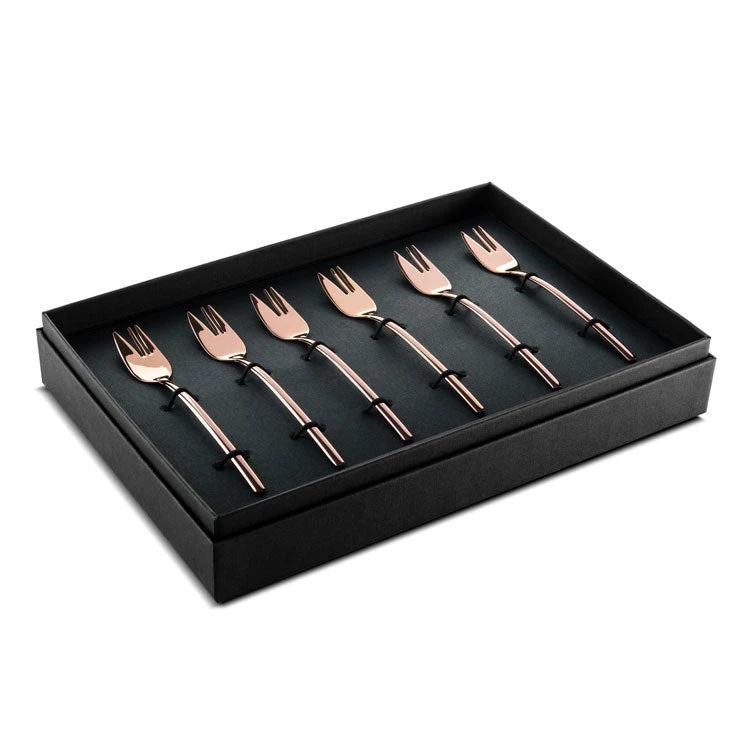 The Due collection by Mepra is flatware that exudes luxury as a lifestyle. Its cool, minimal, sexy style is inspired by influential designers like Angelo Mangiarotti and exalted through generations of tradition, technique, and superb materials. This set of six cake forks features a Bronzo finish.