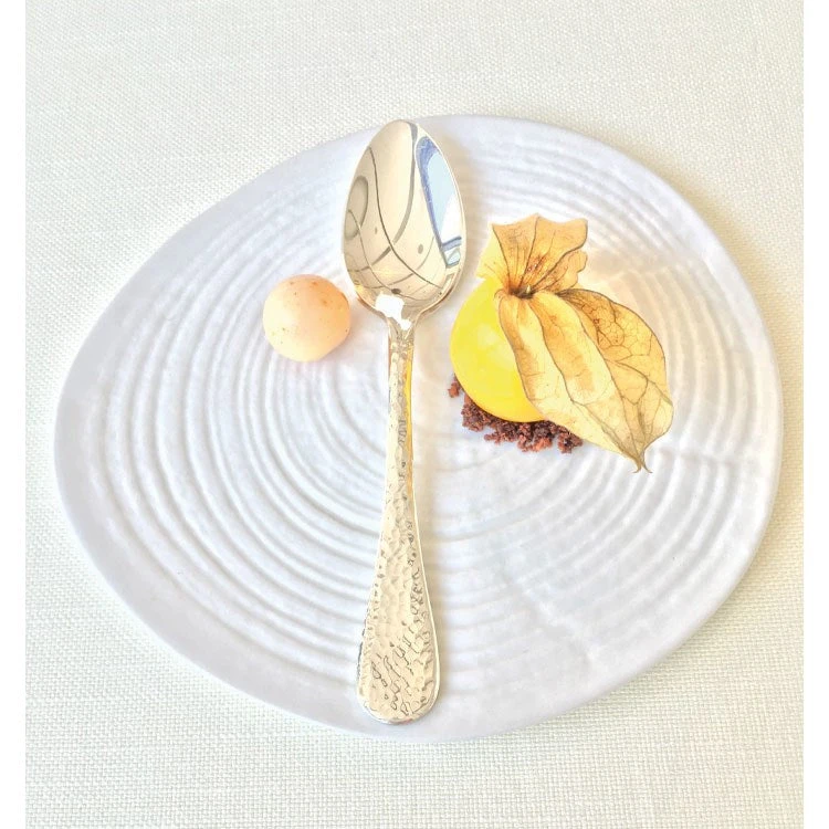 Mepra Epoque flatware will add an air of sophistication to your cutlery ware. This cutlery is made of 18/10 stainless steel, which ensures that it is durable. The hammered pattern is a reproduction of a handmade fork hammered by an artisan from the mountains in northern Italy. The ergonomic handles are very comfortable to hold. This cutlery is resistant to rust, corrosion, fading, tarnishing, and chipping. This five-piece flatware set features a Champagne finish.