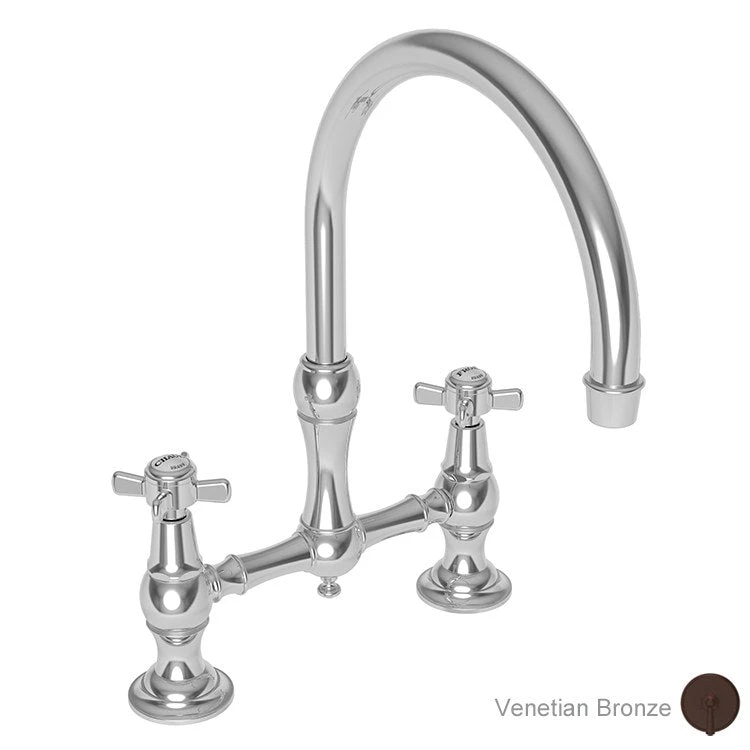 This two-handle bridge kitchen faucet features durable solid brass construction, straight bridge-style brass valve bodies, a high-arc gooseneck swivel spout, and traditional cross-style handles with quarter-turn washerless ceramic disc valve cartridges for smooth operation and drip-free performance.