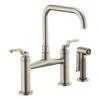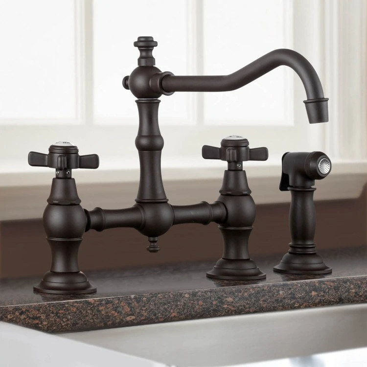 This two-handle bridge kitchen faucet features durable solid brass construction, straight bridge-style brass valve bodies, a swivel spout assembly with an integral diverter, and classic cross-style handles with quarter-turn washerless ceramic disc valve cartridges to ensure smooth operation and drip-free performance. Includes a separate solid brass pull-out side sprayer assembly.