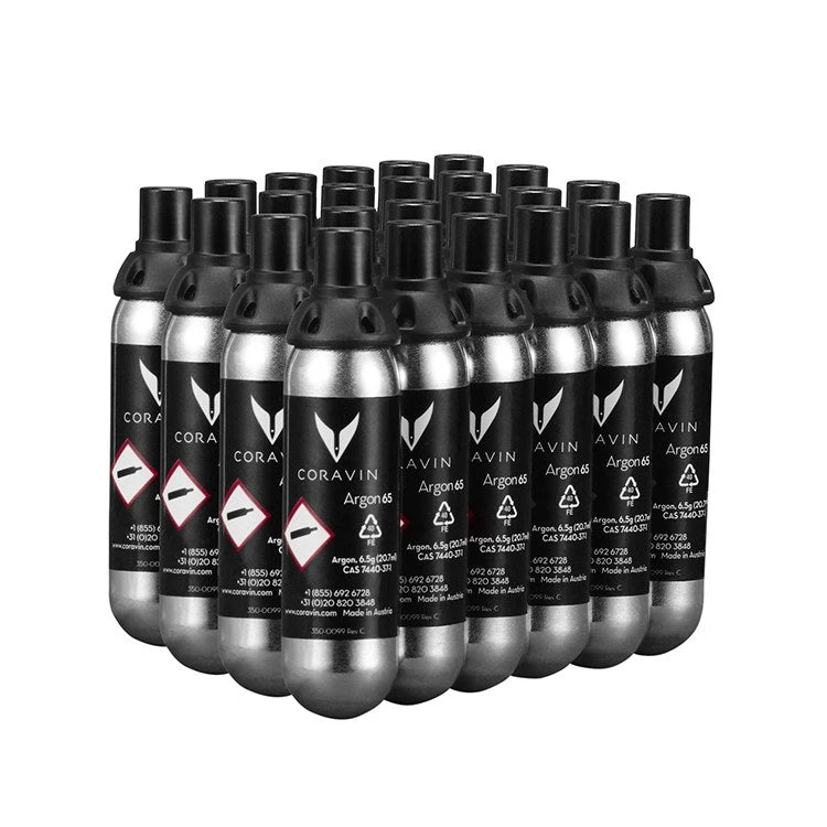 Specifically designed for use with all Coravin Wine Systems, the Coravin capsules pressurize the bottle with argon gas to prevent oxidation and preserve the flavor. Filled with 99.99% argon gas, they ensure a perfect seal and perfect pour every time without effecting the flavor profile. The capsules are produced using manufacturing processes and cleaning techniques that exceed food-grade standards. Each capsule has the power to pour approximately 15 glasses of wine. Pack of 24 capsules.