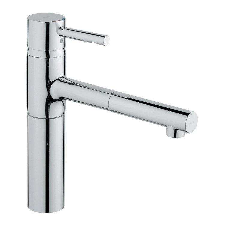 Balanced and poised, the Essence collection takes the purity of the cylindrical form and introduces a softer, timeless quality to modern faucet design. This single-handle kitchen faucet features a 100-degree swivel spout with a pull-out spray head and automatic returning for ease of use. Faucet measures 12-3/8″ high overall with an 8-9/16″ spout reach. Includes braided stainless steel flexible connection hoses.