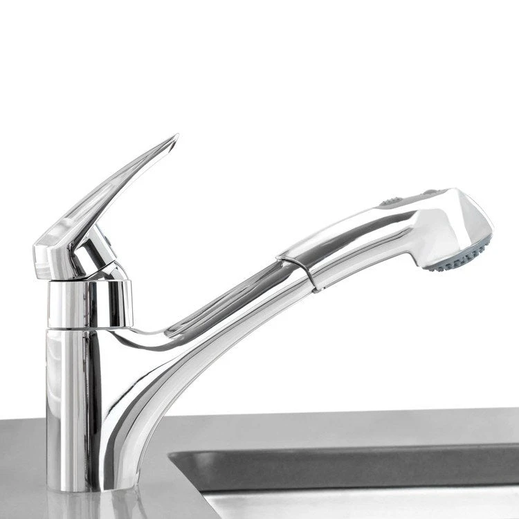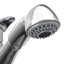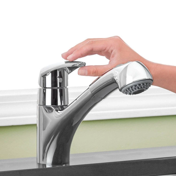 Sleek lines with subtle curves give the Eurodisc collection an enticing and modern style. This single-handle kitchen faucet features a pull-out spray head with locking dual spray control that lets you switch easily switch between regular flow and spray modes. The 56″ retractable hose gives you greater reach to more areas of the sink for easy cleaning. Faucet measures 7-3/16″ high overall with a 9-5/8″ spout reach. Comes with braided stainless steel supply hoses.