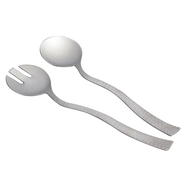 This two-piece salad server set will let you dish up your favorite tossed salad in style. Made of stainless steel for durability and easy-cleaning, they feature a hammered texture and modern wavy handles. The set includes one spoon-shaped and one fork-shaped server.
