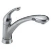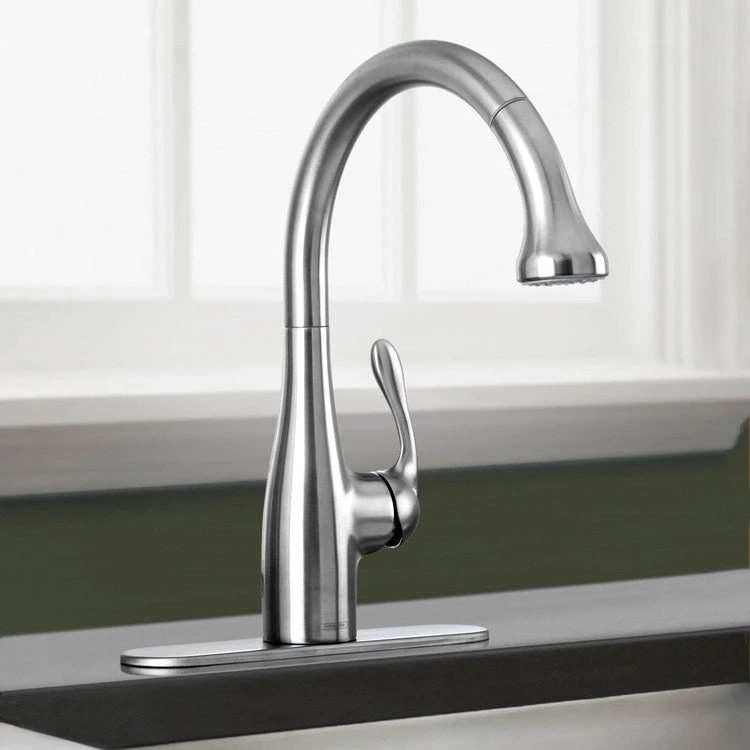 The flowing lines of the transitional Allegro E line in a gently rounded pull down faucet with high arc spout. Pair as prep faucet with larger coordinated kitchen faucet or use as main sink faucet. Locking single control switches between sprays.