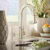 This Joleena Semi-Pro pull-down kitchen faucet features a single lever handle, and a 360-degree swivel spout with a pull-down spray head with an exposed metal reinforced hose with a stainless steel coil protector. The spray head features toggle-button activation with a pause function to temporarily stop the stream of water. Integral check valves prevent back flow. The faucet measures 19-1/8″ high with an 8-7/8″ spout reach. Mounts in single-hole applications in decks up to 2-3/4″ thick.