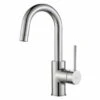 This Joleena single-handle bar faucet has the same transitional styling in a more compact model especially designed for your bar and prep areas. The faucet features solid brass construction, a single lever handle, and a spout that swivels 150 degrees for easy reach and clean-up. The faucet measures 14″ high with a 6-7/8″ spout reach. Mounts in single-hole applications in decks up to 2-3/8″ thick.