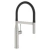This single-hole pull-down prep faucet features solid brass construction, a single lever handle, and a 150-degree swivel spout with a pull-down sprayer that delivers a choice of full and needle spray options. A locking spray diverter lets you easily switch from spout to sprayer use and reverts to default spray mode upon the valve closing. The sprayer docks securely in place using the MagFit magnetic docking system when it’s not in use. The faucet measures 13-5/8″ high with a 7-5/8″ spout reach. Mounts in single-hole applications in decks up to 2-3/8″ thick.