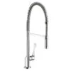 Slender, stylish, and sleek, the Talis S collection combines modern design and functional details for a look that blends in perfectly with any kitchen decor. This single-handle kitchen faucet features a slim pin handle and a spout that swivels 150 degrees to provide better reach around the sink. The faucet measures 13-7/8″ high with a 7″ spout reach. Mounts in single-hole installations in decks up to 2-3/4″ thick.