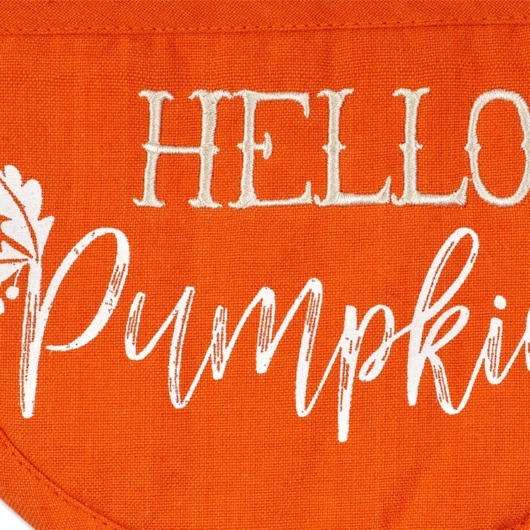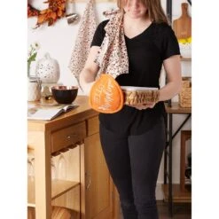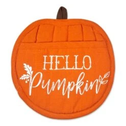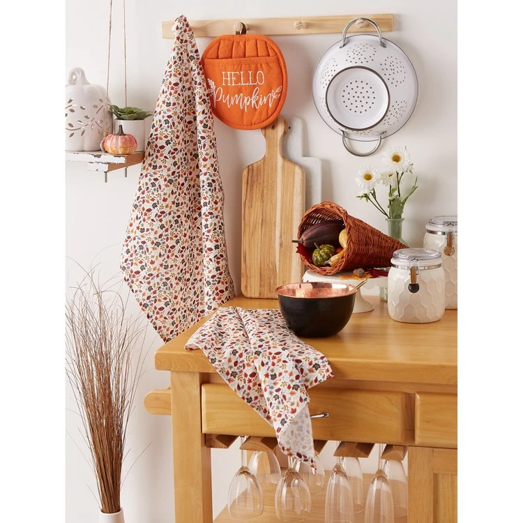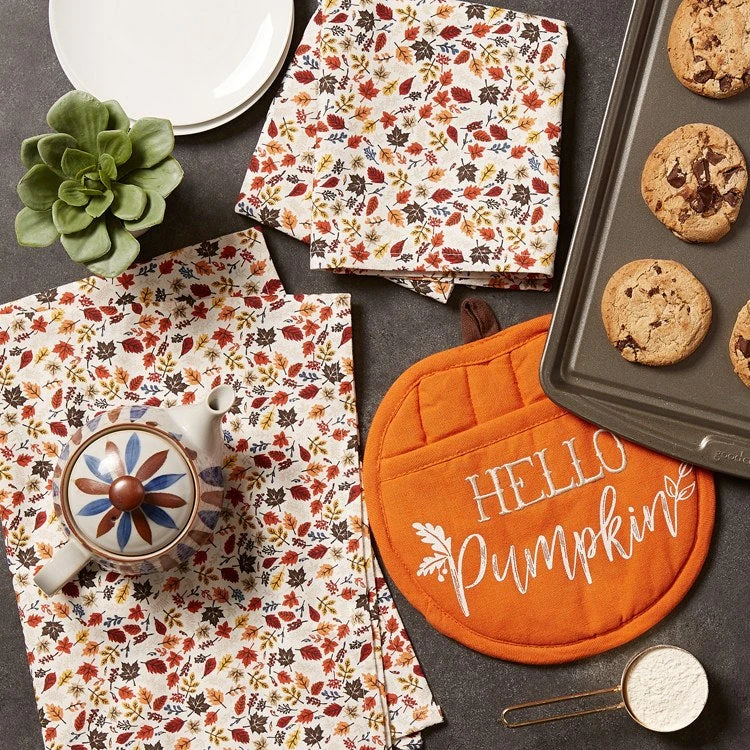 Add some fun with this adorable hello pumpkin potholder set. It includes two dish towels and one potholder.