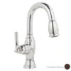 This single-handle pull-down bar/prep faucet features solid brass construction, a swivel spout assembly with a side-mounted, ADA-compliant lever handle and a two-function, pull-out sprayer with toggle-button control to switch from spray or stream modes. A magnetic docking system secures the spray head to the spout when it is not in use. The faucet measures 14-7/8″ high with a 6-9/16″ spout reach.