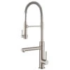 The faucet features a swivel spout assembly with a side-mounted, ADA-compliant lever handle and a pull-out sprayer with a pivoting-ball spray head inlet fitting for enhanced directional control. The toggle button lets you easily switch from spray or stream modes, and the magnetic docking system keeps the sprayer secure when not in use. Measures 16-1/2″ high with an 8-9/16″ reach.