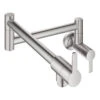 This two-handle, wall-mounted pot filler faucet lets you easily fill pots full of water right at the stove. Saves you the hassle and effort of lugging a heavy pot from the sink to the cooktop. This faucet features lever handles and a double-jointed design that pivots out to reach any burner location and folds back against the wall when not in use. Measures 26-3/4″ long when fully extended.