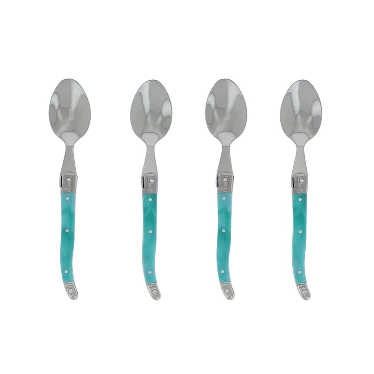 French Home’s traditional and distinguished Laguiole design featuring the iconic three rivet curved handle and bee emblem are elegant and comfortable to hold. Excellent for fruit, dessert, tea or coffee at your afternoon soiree and a quintessential addition to your finale to dinner. Perfectly sized at 6″ these spoons with exceptionally beautiful turquoise handles are dishwasher safe. Pair them with the French Home Laguiole cake forks for a perfect dessert/amuse bouche set. Laguiole is a town in France where this style originated. The spoons come in a handsome box making it the ultimate gift for your favorite host or anyone who likes to entertain.