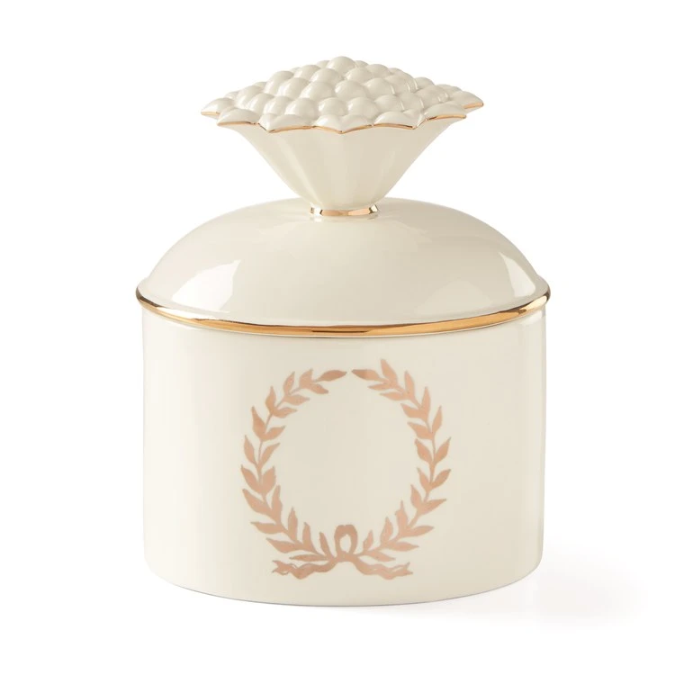Luxe in glossy white porcelain, this covered box honors Lenox’s 130+ year history with its shimmering update of their signature icon: the laurel leaf. It’s designed as a modern retelling of Lenox’s past that also serves an elegant refresh to your home. The sumptuous curves, textured berry lid and golden accents make this box a gorgeous statement piece for your mantel.